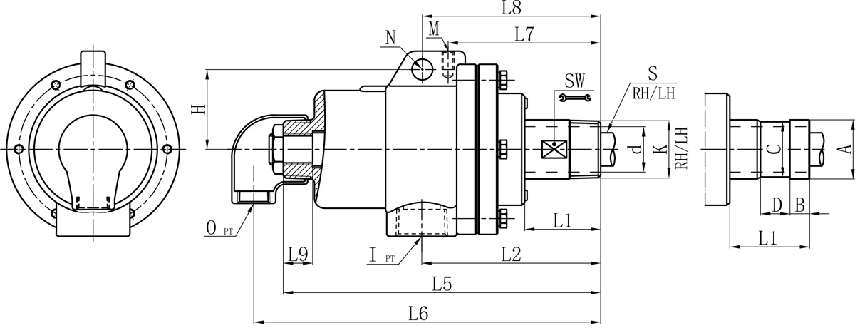| Model | K | I | O | S | d | L1 | L2 | L5 | L6 | L7 | L8 | L9 | M | N | H | SW | 法蘭式外管尺寸對(duì)照表 | |||