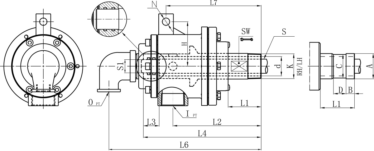 | Model | K | I | O | S1 | d | L1 | L2 | L3 | L4 | L6 | L7 | N | H | SW | 法蘭式外管尺寸對(duì)照表 | |||